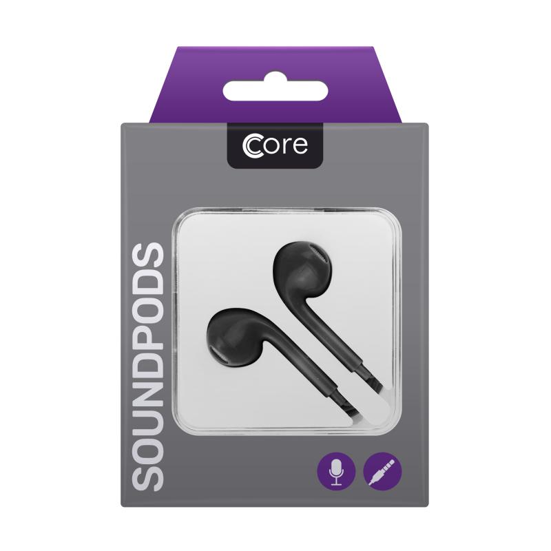 Core Stereo SoundPods with Microphone. Comfortable fit and high-quality audio with built-in remote to adjust volume, manage playback and answer or end calls, plus an integrated microphone so you can use your phone on the go.