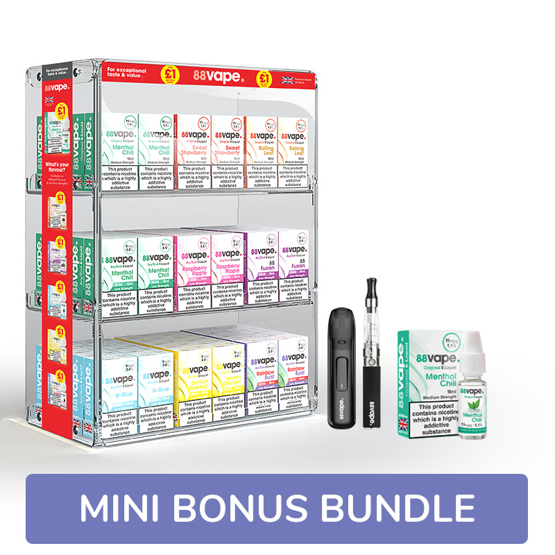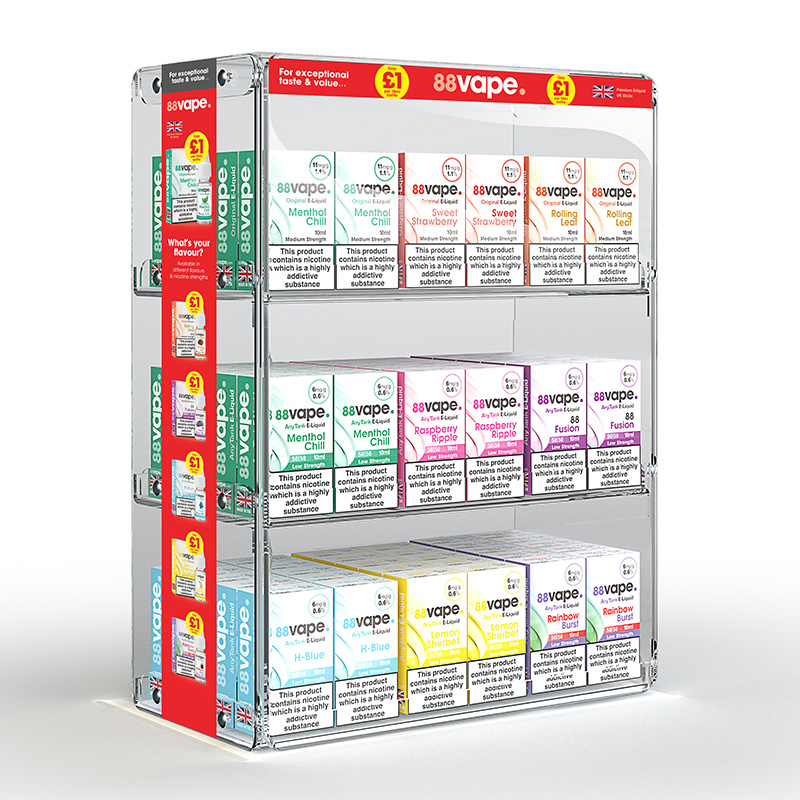 *Please note that the 88Vape branded counter display unit (CDU) remains the property of Core Communication Retail Limited and can be reclaimed if minimum sales rates are not met. Only 1 offer per retail address. The 88Vape CDU can be purchased for £45.00 (ex VAT) and you may be charged if the CDU is lost or damaged. It is at the discretion of Core Communication Retail Limited that this fee may be waivered.