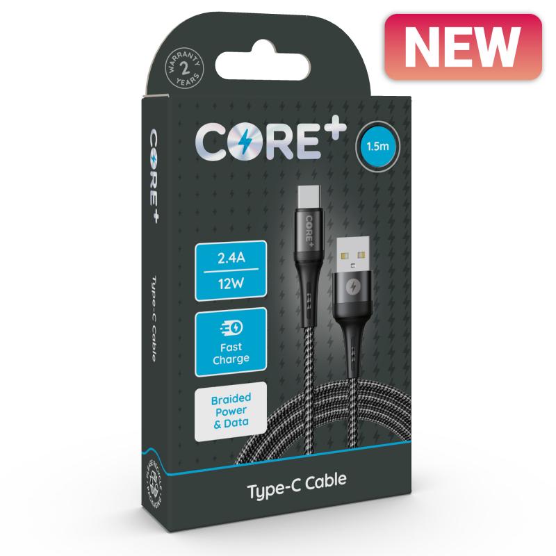 CORE+ Type-C Cable 1.5m Braided Grey 2.4A/12W Fast Charge