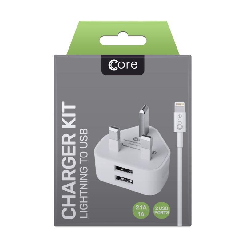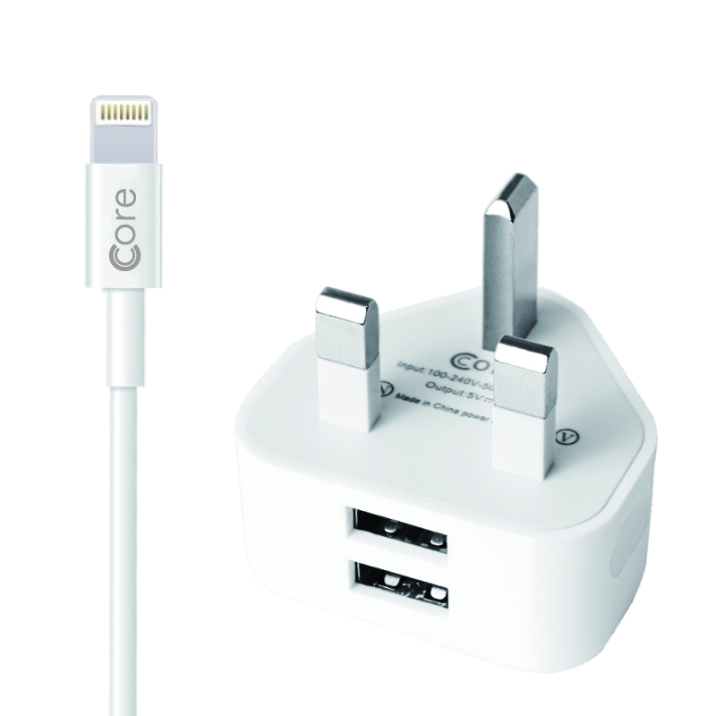 Compatible with most Apple Devices. Core's Charger Kit with Lightning Cable connects directly to the wall for a fast charge. Whether it is a replacement or a spare, our charger kit is an essential accessory for Apple users. Extremely versatile, the cable can be disconnected and used for syncing and file transfer via USB.