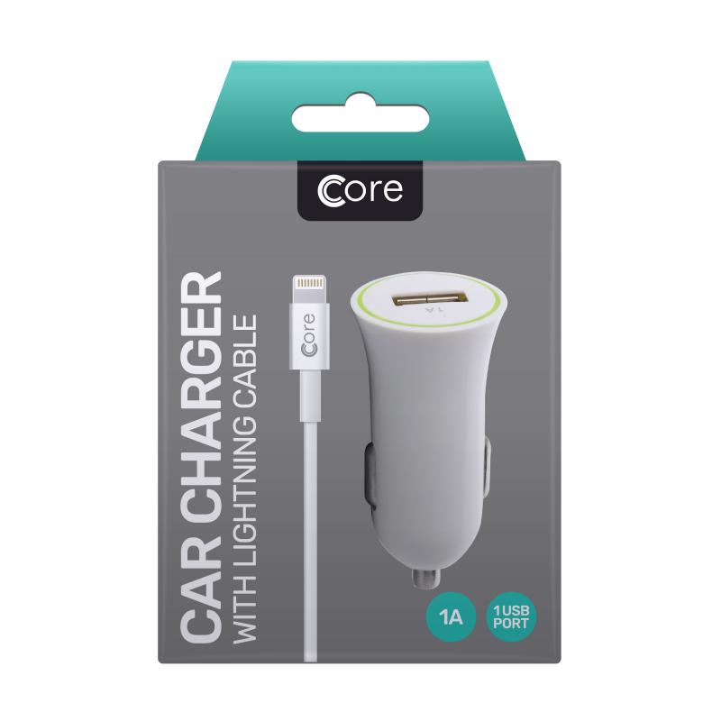 Core's USB Car Charger with Lightning Cable will charge your device on the go. Simply plug the charger into your cigarette lighter and connect your device via the Lighnting cable.