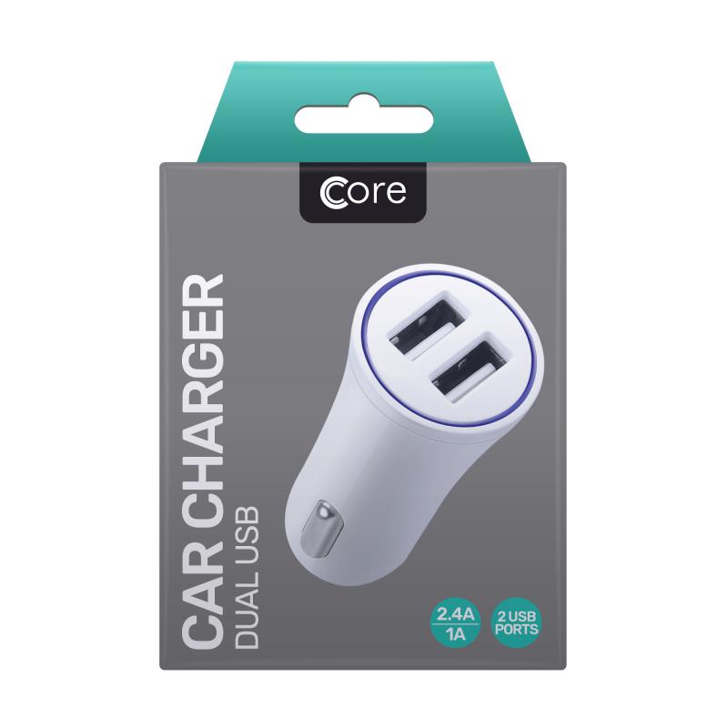 Core's Dual USB Car Charer will work with any USB cable to charge your devices on the go. Simply plug the charger into your cigarette lighter and connect your device via a USB cable.
